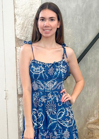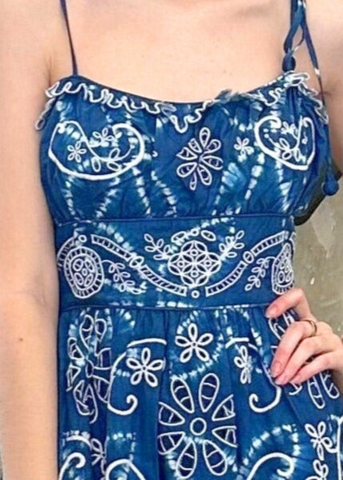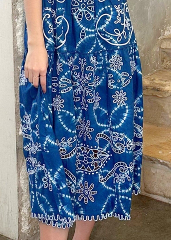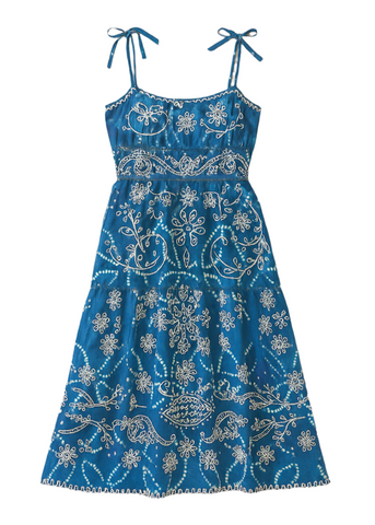 The Liat embroidered dress features eyelet floral detailing throughout, ruffle trim, scalloped hem and self tie straps with pom poms.