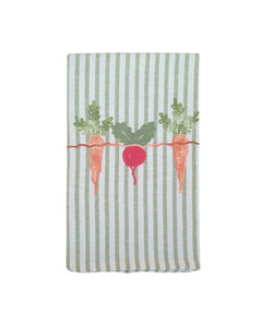 Due Fragole Embroidered Green Striped Kitchen Towel in Carrot + Radish