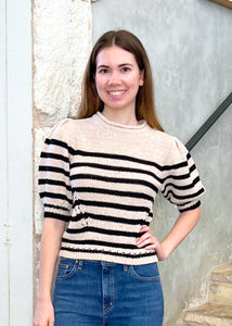 Ottilie Luxe Ribbed Cashmere Puff Sleeve Sweater in Noir Stripe