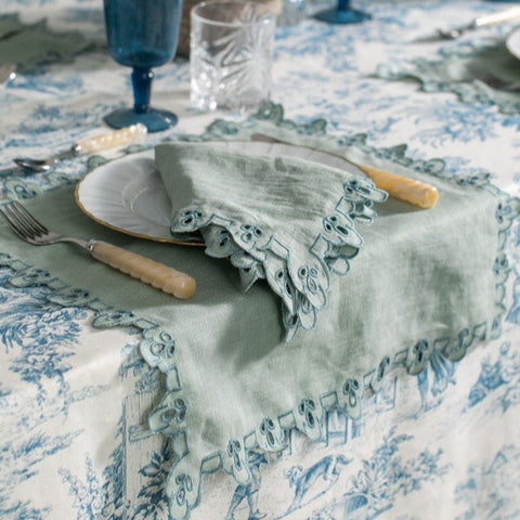 These Italian coated cotton napkins are made in a simple solid cotton fabric but are elevated to elegance with unique cut scallop edges and eyelet holes finished using a contrasting embroidery thread. Not simply a placemat, but a distinctive detail that can decorate and enhance your tablescape! Perfect when paired with the Amalfi placemats, but equally beautiful in combination with a simpler table setting.