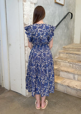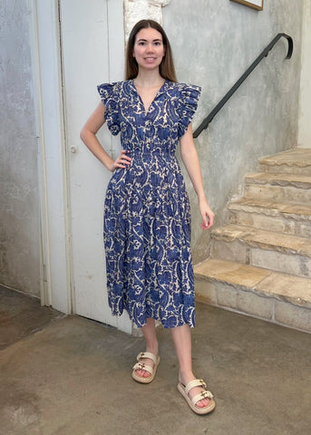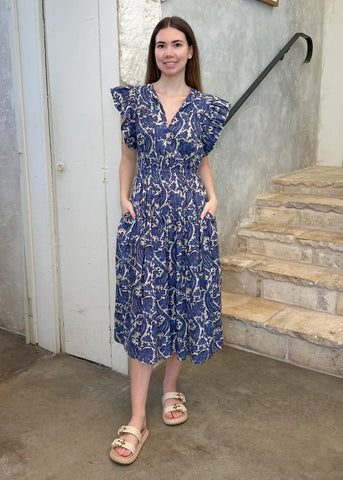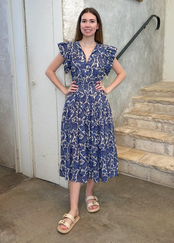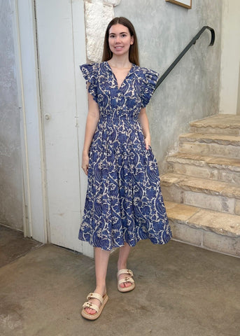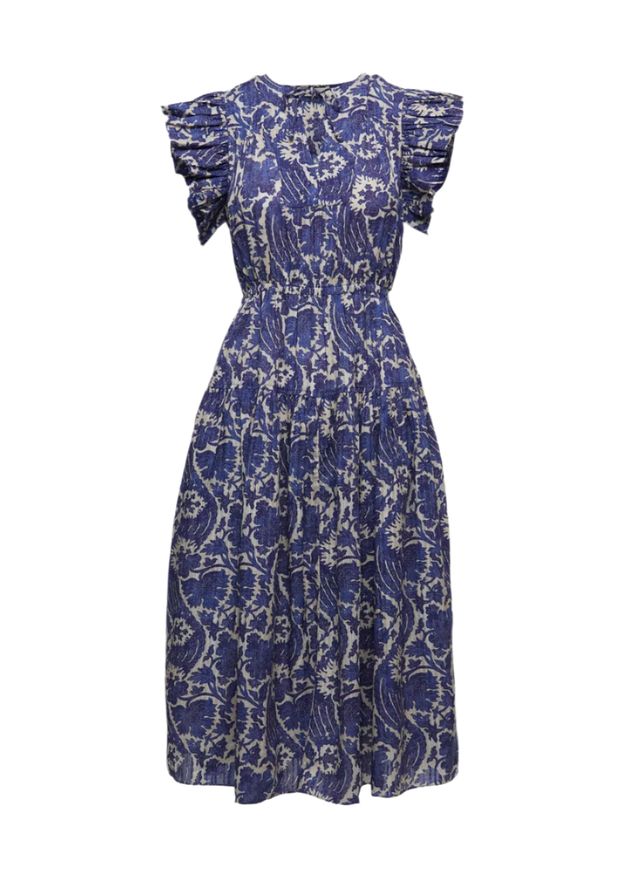 The Kairi is a classic Ulla Johnson dress, designed with short sleeves that flutter and a midi hemline with breezy volume. Crafted from a cotton blend, it features bold botanicals inspired by a vintage indigo panel that are printed atop subtle stripes. This multicolored dress effortlessly pulls over and has side pockets. The neckties fasten or can be left undone.