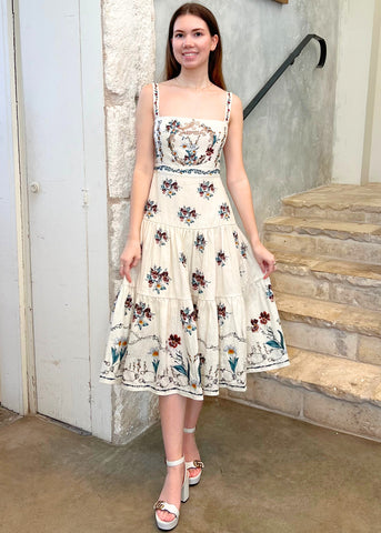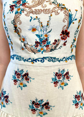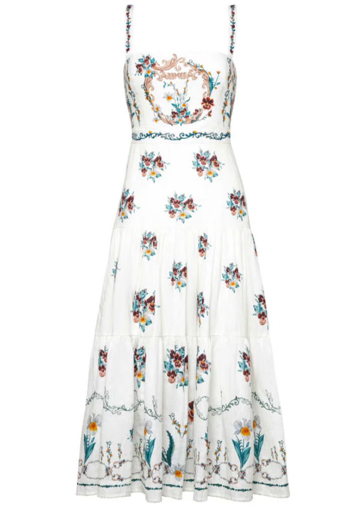 The 'Lima Florero' midi linen dress is a top-selling piece. Hand-embroidered, this dress features adjustable straps, concealed zip fastening along the back, and a pretty A-line silhouette.