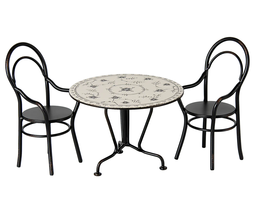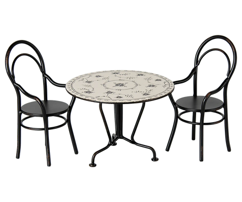 Invite your friend for Sunday supper at the dining table. The round table comes with 2 metal chairs. The table and chairs fit in the dollhouse, where rabbits and bunnies in size 1 and 2, and Teddy family can be seated.