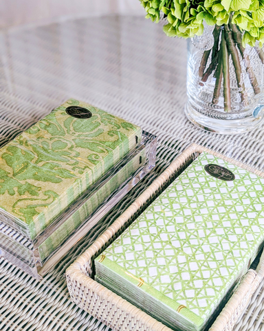 Perfectly sized to hold Caspari paper and paper linen napkins, these napkin holders are an easy addition to any tabletop décor. Use them to keep napkins neatly presented and always within reach in your dining room, on your coffee table, kitchen counter, or in a guest bath. The rattan style napkin holders coordinate well with all Caspari Napkin designs, colors, and seasonal styles. The collection is crafted from naturally beautiful woven rattan material.