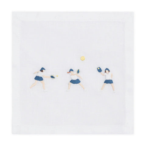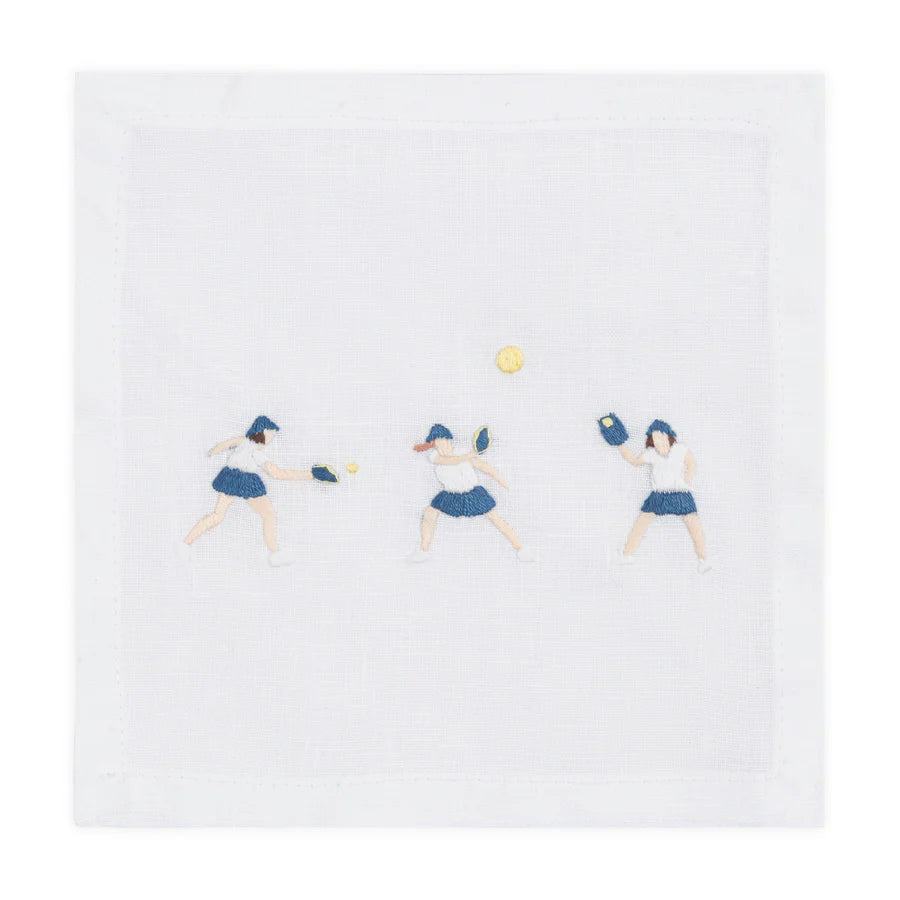 Serve up some style with this set of four linen pickleball coasters, embroidered with playful paddle-and-ball designs. Whether you're rallying on the court or toasting post match, these are the perfect accessory for any pickleball enthusiast's entertaining lineup.