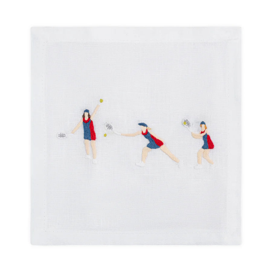 Game, set, match-your cocktail hour just got an upgrade. This set of four linen coasters features charming embroidered tennis player motifs that bring a sporty twist to your tabletop. Perfect for tennis lovers, summer soirees, or gifting with a playful serve of style.